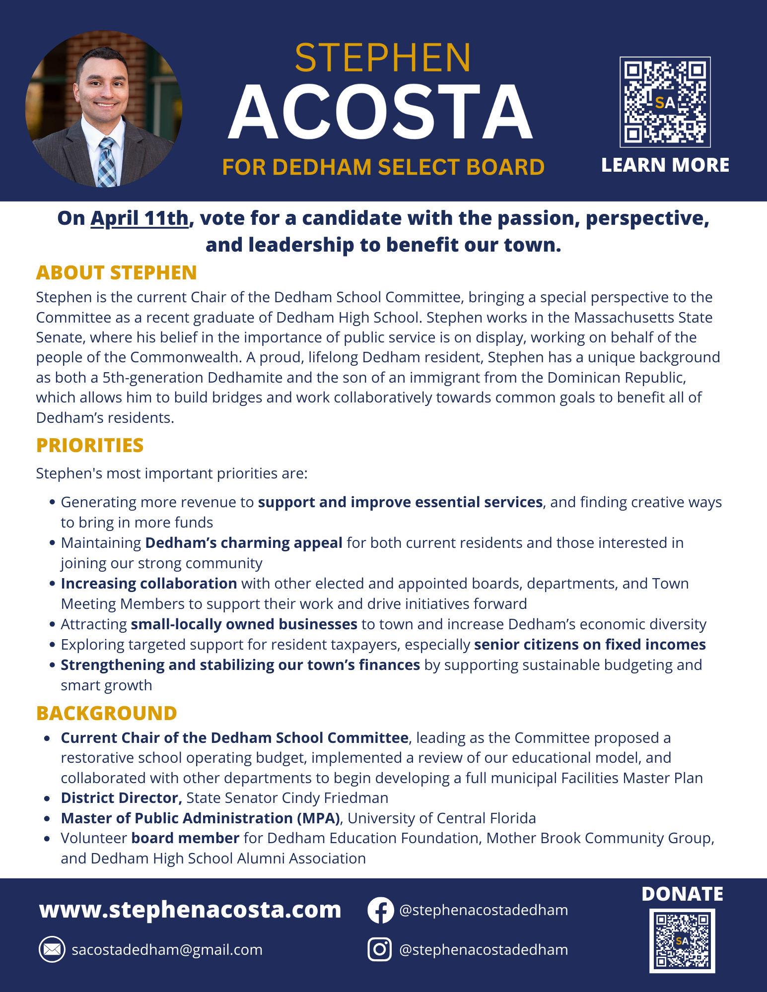 Stephen is the current Chair of the Dedham School Committee, bringing a special perspective to the Committee as a recent graduate of Dedham High School. Stephen works in the Massachusetts State Senate, where his belief in the importance of public service is on display, working on behalf of the people of the Commonwealth. A proud, lifelong Dedham resident, Stephen has a unique background as both a 5th-generation Dedhamite and the son of an immigrant from the Dominican Republic, which allows him to build bridges and work collaboratively towards common goals to benefit all of Dedham’s residents.